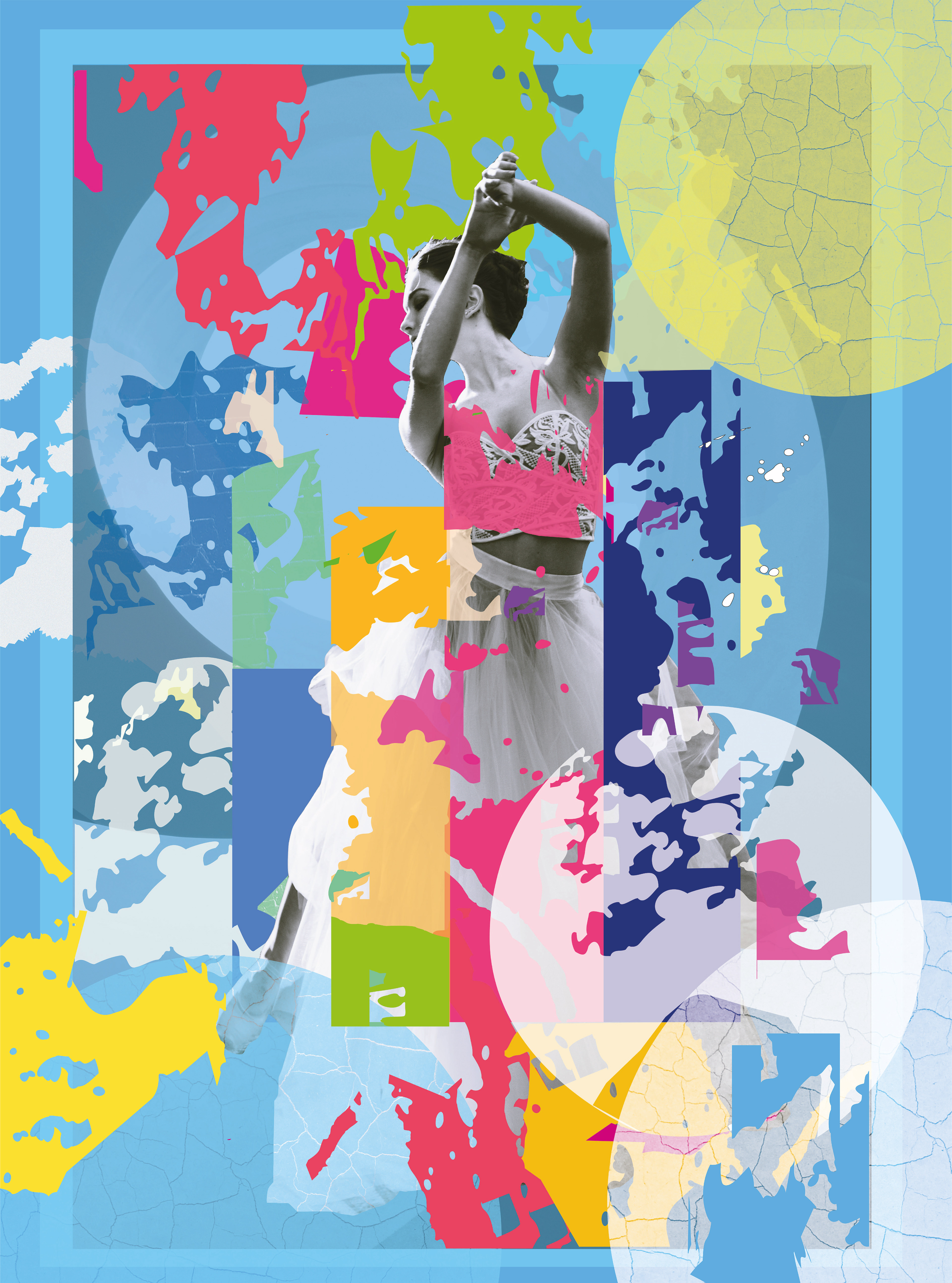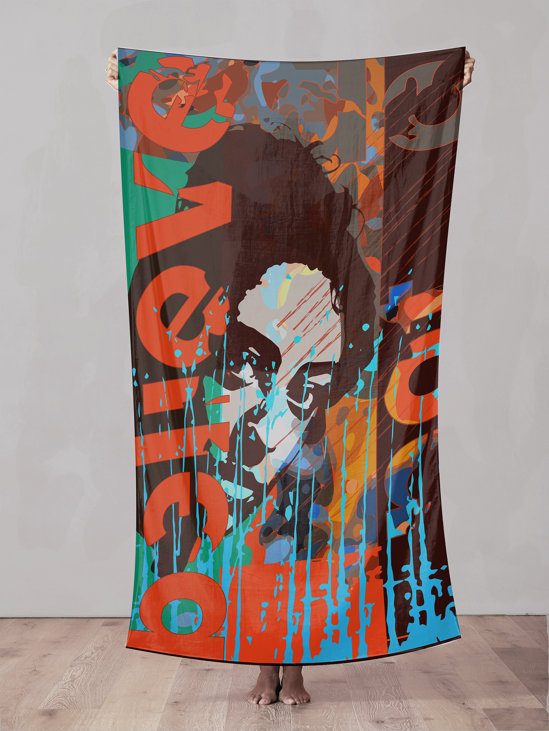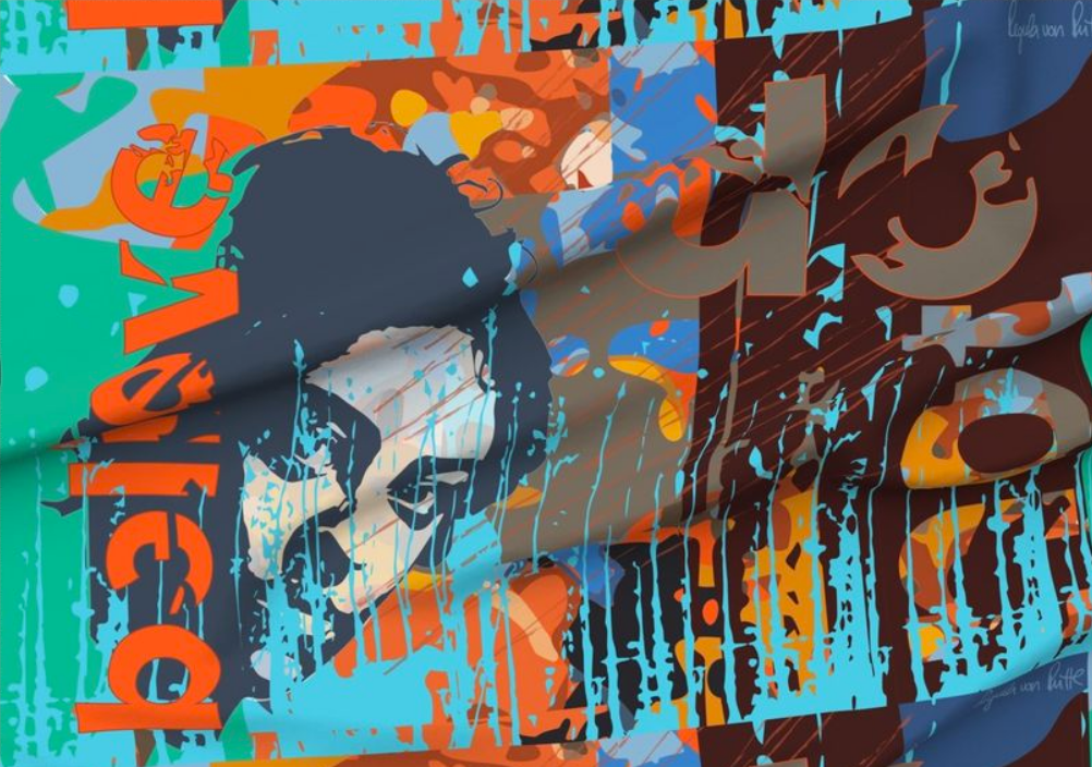 Die Wandbilder beginnen mit einem Portrait oder einem Bild, das mir begegnet. Wörter, Sätze finden ihren Weg und beeinflussen die Gestaltung der Farben und Formen.
